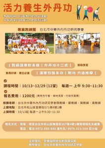 為傳承張大師丹功濟世救人之精神,台北市外丹功學會即將於2025年11月7日(週五)在會館開辦新班,歡迎大家介紹親朋好友一起來煉功。