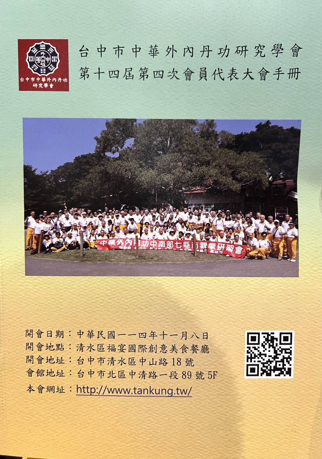 9 11 月, 2025 陳 定沅 0 Comments 2 categories 2025年11月8日 本會總幹事林麗惠師姐及副總幹事陳定沅師兄代表參加「台中市中華外內丹功研究學會」第十四屆第四次會員大會,恭賀大會圓滿成功! 地點:台中清水福宴樓 陳淑慧 文書組長 分享 Category: 丹功觀摩研習, 歷史活動 發佈留言 取消回覆很抱歉,必須登入網站才能發佈留言。 文章導覽 Previous: 2025.11.7本會開辦「會館週五初級班」,舉行開班典禮並開始上課Next: 2025.11.9本會林建廷理事長、名譽理事長黃錫堯師兄、常務理事曹麗雪師姐及文書組長陳淑慧師姐代表參加「南投市中華外內丹功運動學會」114年會員大會 相關文章 2024.11.17林建廷理事長代表本會參加「南投縣中華外內丹功運動協會」第十二屆第四次會員代表大會 2024年11月17... 編輯按鈕 2025.7.7丹功觀摩學習之旅 PART2 2025年7月7日 ... 編輯按鈕 2024.3.18本會舉辦「113(2024)上半年度場地巡迴訪視關懷活動」Part 1 2024年3月18日... 編輯按鈕 2024.03.14林建廷理事長帶領本會理監事暨會務幹部一行30人至台中大肚山參加「張志通大師歸真28週年追思紀念活動」 2024年3月14日... 編輯按鈕 2025.7.4「虎嘯公園班」慶祝成立七週年,舉辦台灣藝術教育館、歷史博物館及植物園半日遊及餐敍聯誼活動 2025年7月4日 ... 編輯按鈕 台北市外丹功學會113年(2024)下半年度場地巡迴訪視關懷活動 Part 1 *8月7日訪視場地:... 編輯按鈕